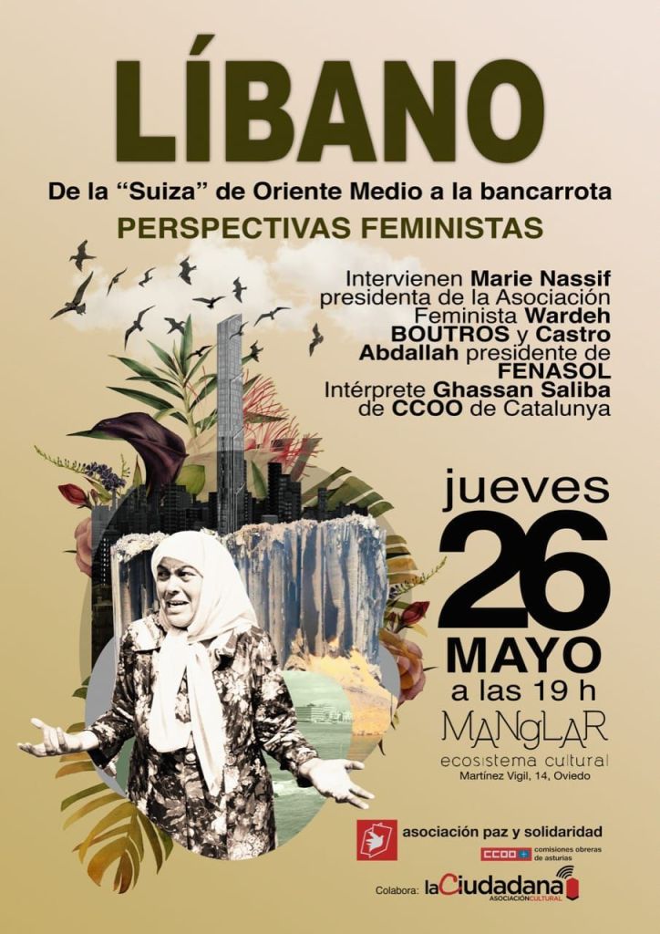 La frágil situación de las mujeres y de la clase trabajadora en el Líbano ocupó esta tarde la conferencia que, organizada por la Fundación Paz y Solidaridad de CCOO Asturias, ofrecieron Marie Nassif (de la organización feminista Wardeh Boutros) y Castro Abdallah, presidente de la organización sindical Fenasol, en El Manglar. La revuelta popular de 2019, respuesta a la difícil situación económica y a la falta de libertades se vio frenada por la situación pandémica, pero las elecciones del 15 de mayo abren tímidamente la ventana a la esperanza, con vientos de juventud y laicidad.
