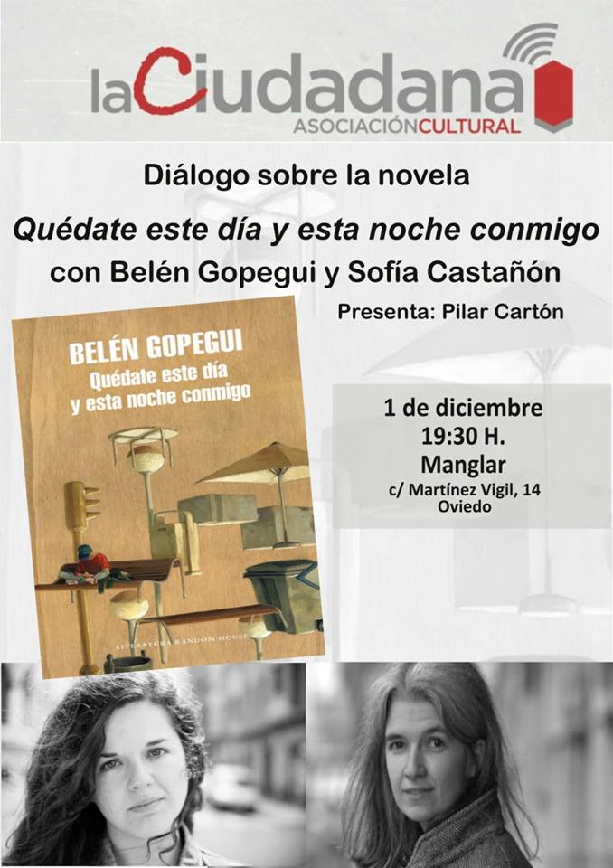 Este viernes día 1 de diciembre La Ciudadana, Asociación Cultural organiza la presentación de «Quédate este día y esta noche conmigo», la última obra de Belén Gopegui, una las mejores novelistas actuales en nuestro país.