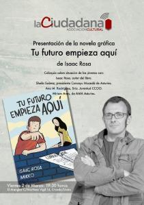 La Ciudadana, Asociación Cultural organiza en El Manglar (calle Martínez Vigil, 14, Oviedo) el viernes 2 de marzo a las 19:30 horas la presentación de la novela gráfica «Tu futuro empieza aquí», con la presencia del autor Isaac Rosa.