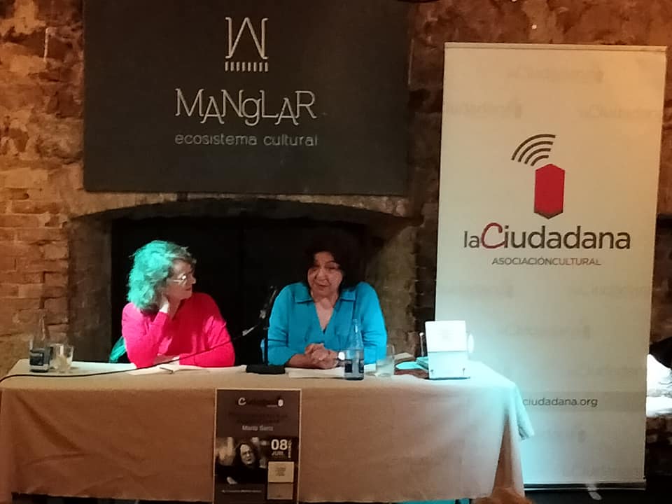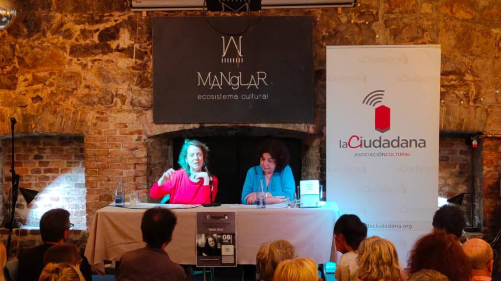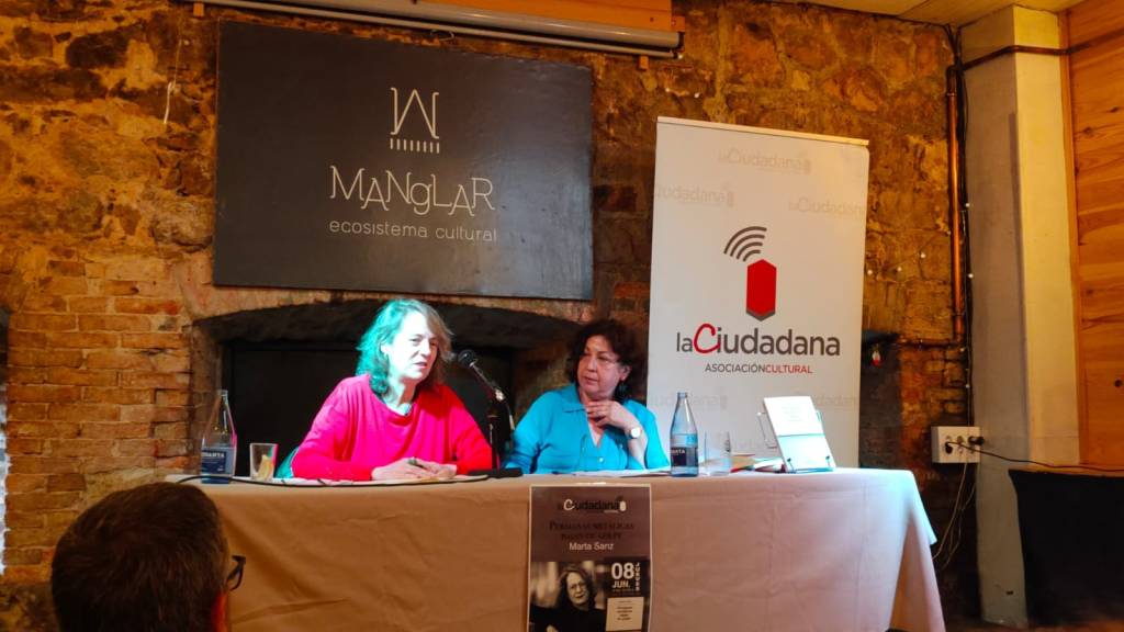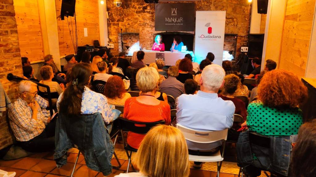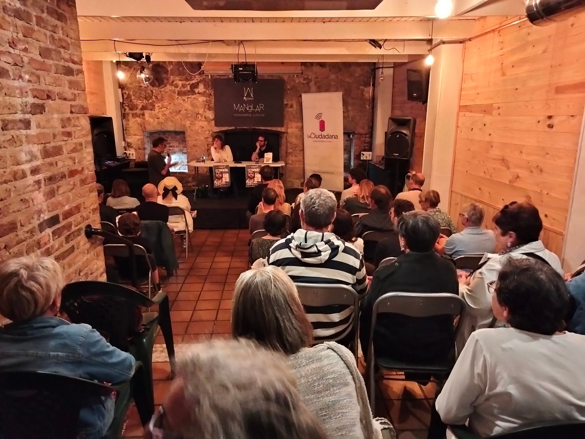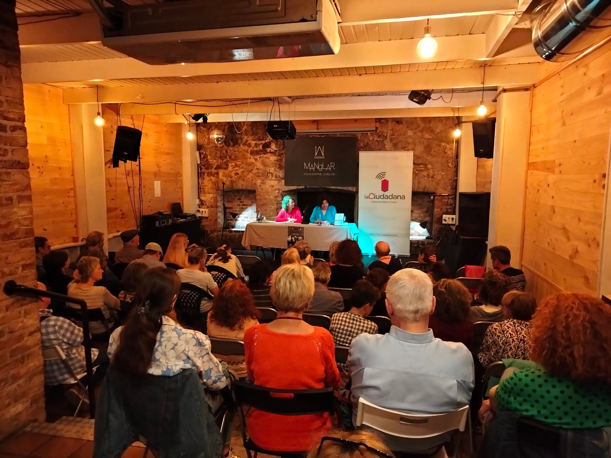 «Persianas metálicas bajan de golpe», último libro de Marta Sanz, sirvió de excusa para una brillantísima disertación de la autora, acompañada en la presentación por la profesora de literatura María Victoria Martín Arias. La pandemia sirvió a Marta como momento de reflexión para unas generaciones que hasta ahora habían transitado más o menos plácidamente su existencia. Y para diseñar para su novela un mundo distópico, no necesariamente mejor, como se llegó a plantear en aquel tiempo, en el que aplaudimos lo público desde nuestros balcones. El capitalismo, voraz, impone sus lógicas en lo cultural, en lo electoral, en lo vital. El público, que llenó El Manglar, celebró las reflexiones con un largo aplauso y Marta se adscribió a la nómina de autores/as de cabecera de La Ciudadana, Asociación Cultural.