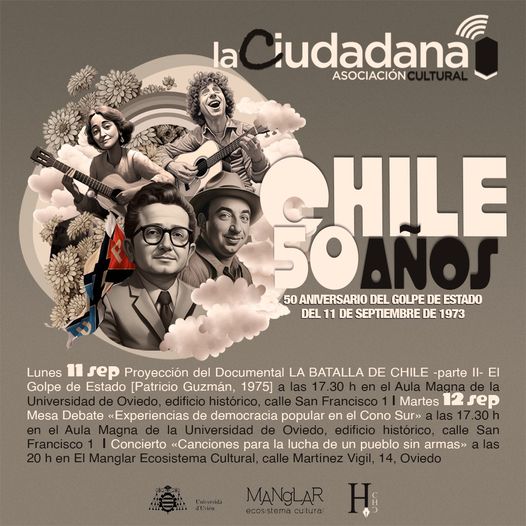 El martes 12 de septiembre una mesa redonda con los historiadores de la Universidad de Oviedo Francisco Erice y Lisardo Cañón, acompañados del historiador de la Universidad de Santiago Francisco Javier Morales Aguilera, analizarán lo sucedido y el contexto político en el Cono Sur latinoamericano y, a partir de las 20:00 horas, en El Manglar, Ecosistema Cultural, un recital musical rememorará los cantos populares chilenos que pusieron marco a los anhelos de libertad de aquel país.