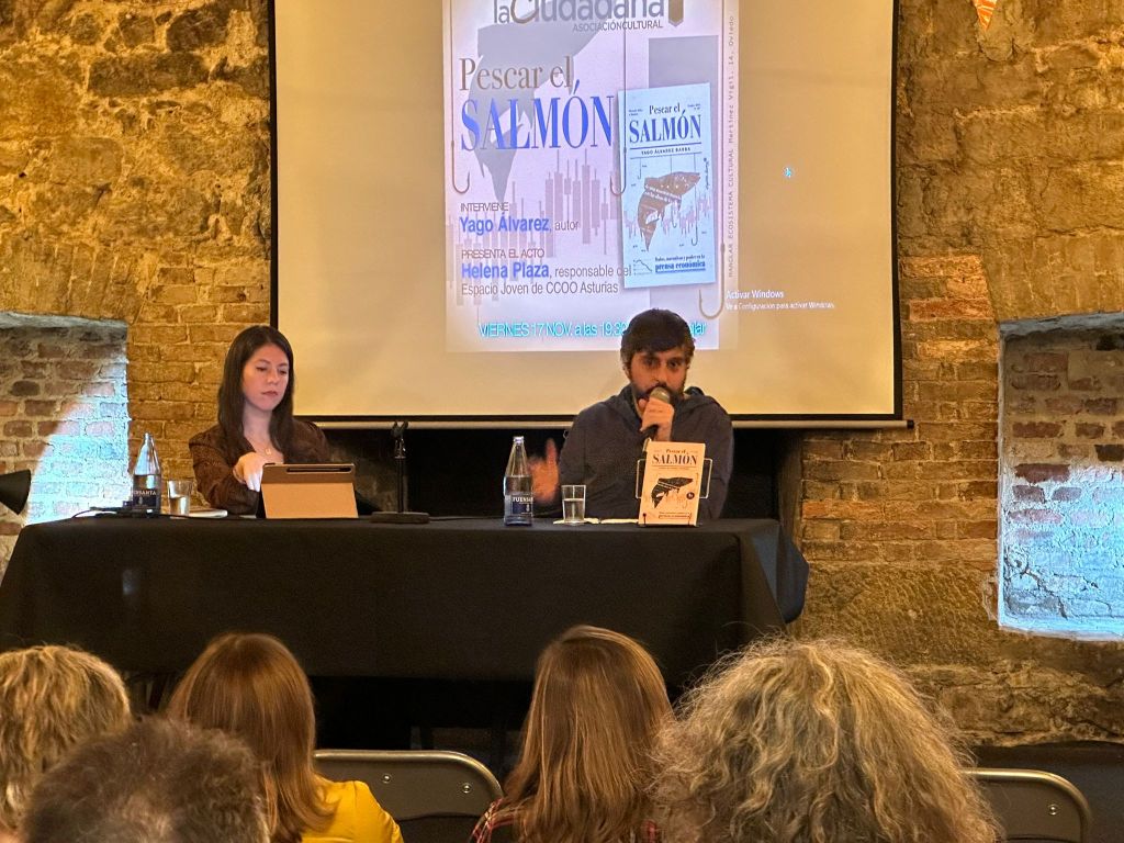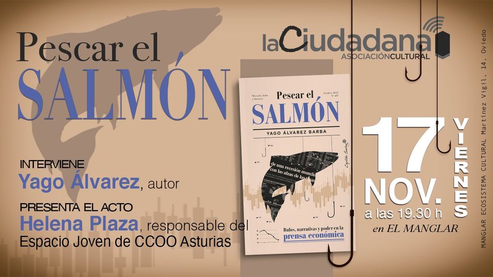 «Pescar el salmón» no es exactamente un aburrido libro de Economía, ni siquiera de Economía crítica. Es una herramienta para poder enfrentar la narrativa de la prensa del poder y, más concretamente, de la narrativa de la prensa económica. Son, en palabras de Yago Álvarez, su autor, economista cabreado y militante de la contrainformación, unas gafas para enfocar mejor los análisis en materia económica. En diálogo con Helena Plaza, responsable del Espacio Joven de CCOO de Asturias, Yago disertó sobre los bulos mediáticos, la composición de la propiedad de los medios salmón, y dio cumplida respuesta a las numerosas inquietudes del público asistente en El Manglar, sobre fiscalidad, seguridad social, privatizaciones, política presupuestaria,… El libro va ya por su tercera edición, y abre un debate necesario sobre los paradigmas de la información económica, mecanismo de ideologización de la sociedad en su conjunto.